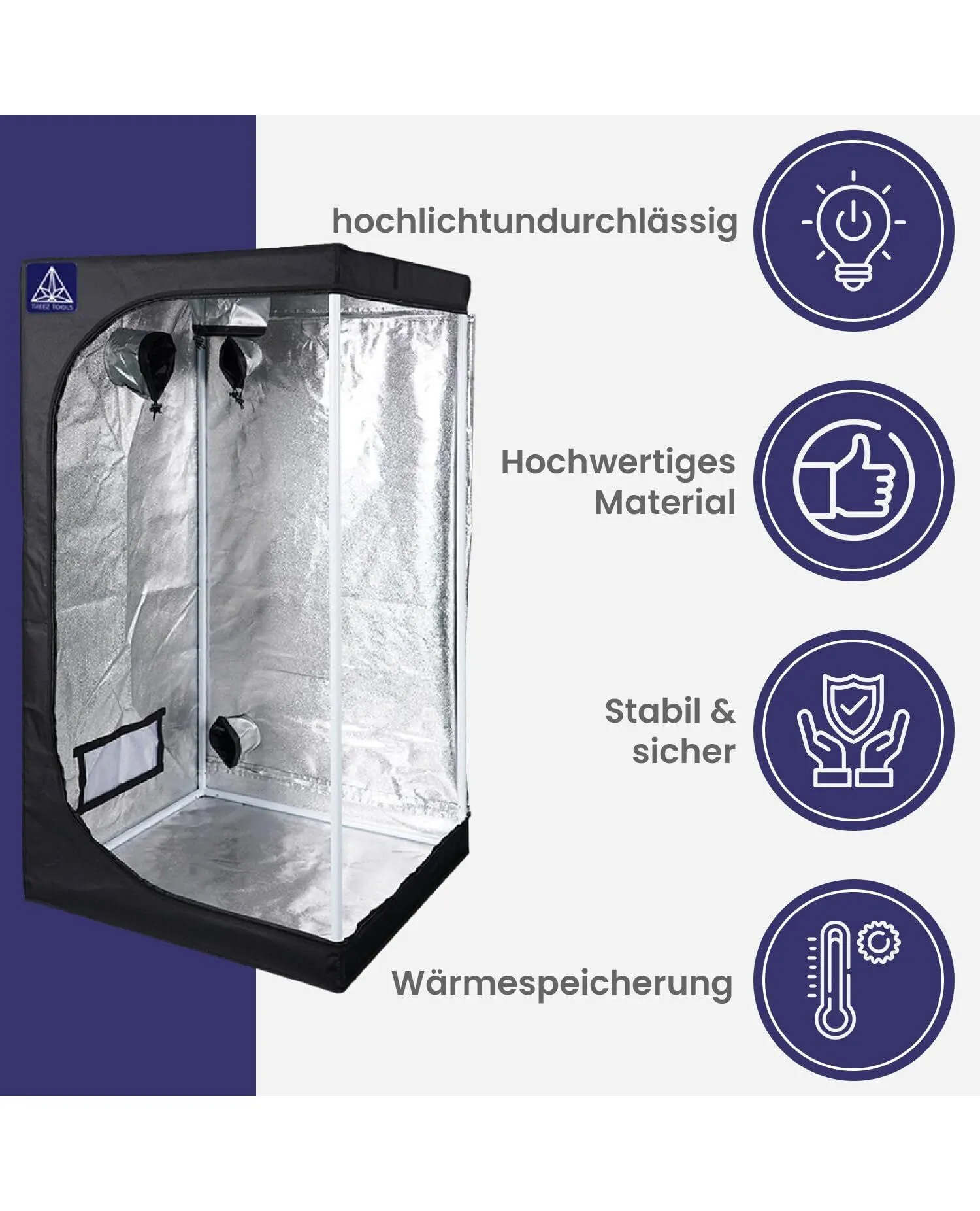 Grow Zelt (80 x 80 x 180 cm): Langlebiges Zelt mit robusten Nylon-Reißverschlüssen, doppelt genähten Nähten, reflektierendem Mylar-Futter (95%) für optimale Lichtverteilung und Belüftungsöffnungen für eine effiziente Luftzirkulation.